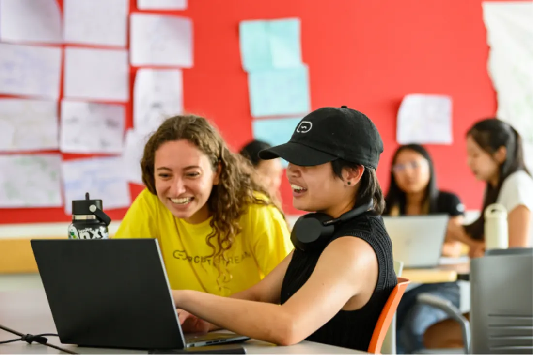Two students sit at a desk working together on a laptop, smiling, in a classroom with sketches and drawings on a red wall in the background.